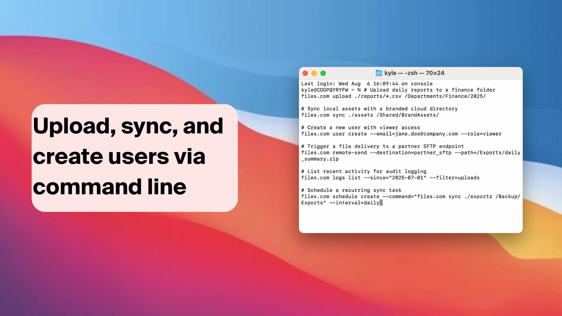 The CLI App can be used on Windows, Linux, and macOS based systems, allowing you to interact with, and manage, your Files.com site from any platform. Embed Files.com capabilities into your PowerShell scripts, bash scripts, and more, allowing your IT team to automate your business processes and speed up business partner onboarding and offboarding.