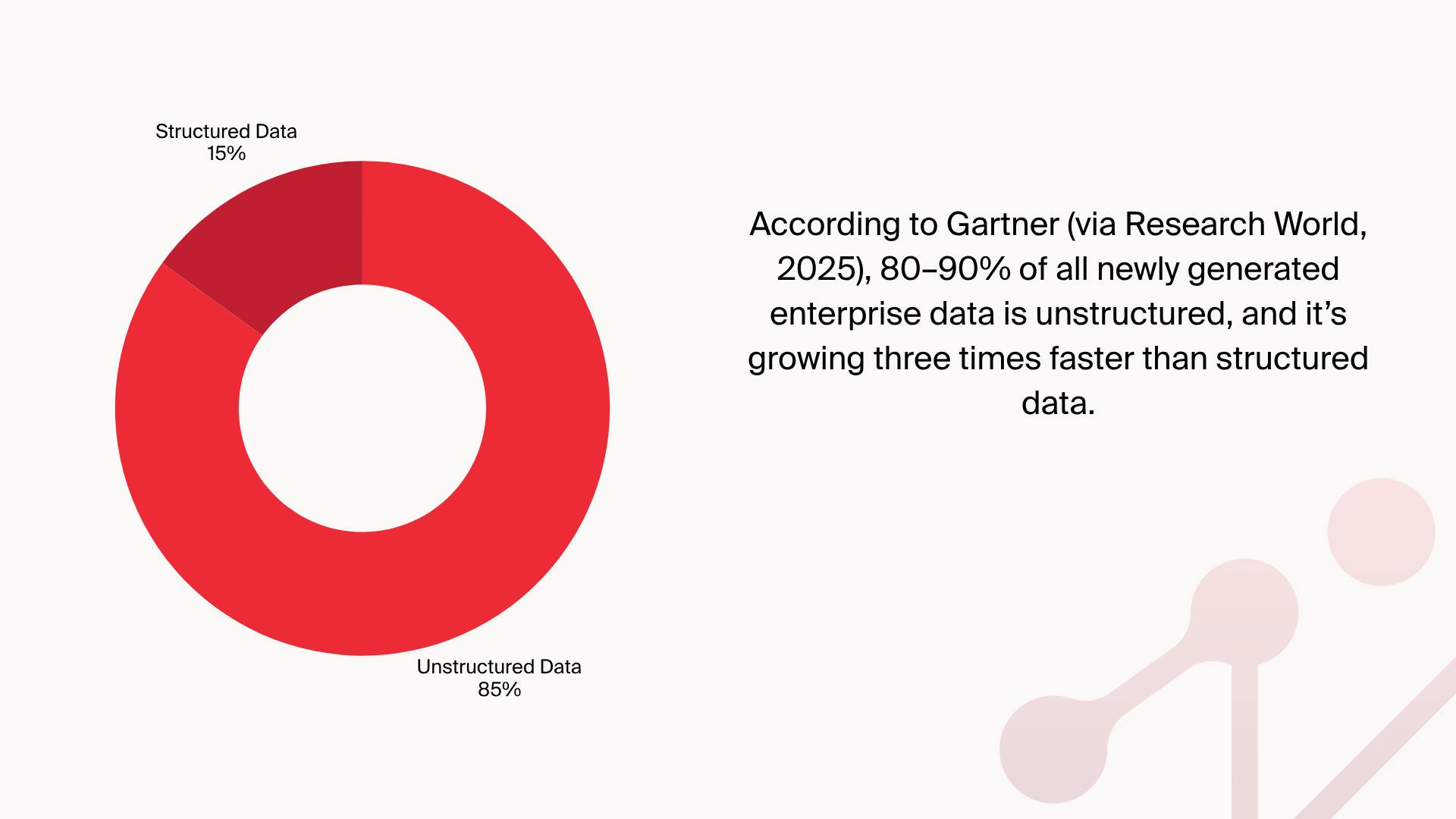According to Gartner (via Research World, 2025), 80–90% of all newly generated enterprise data is unstructured, and it’s growing three times faster than structured data.