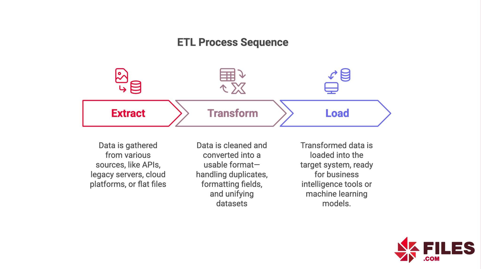 Extract: Pulls data from various sources like APIs, legacy servers, cloud platforms, or flat files.
