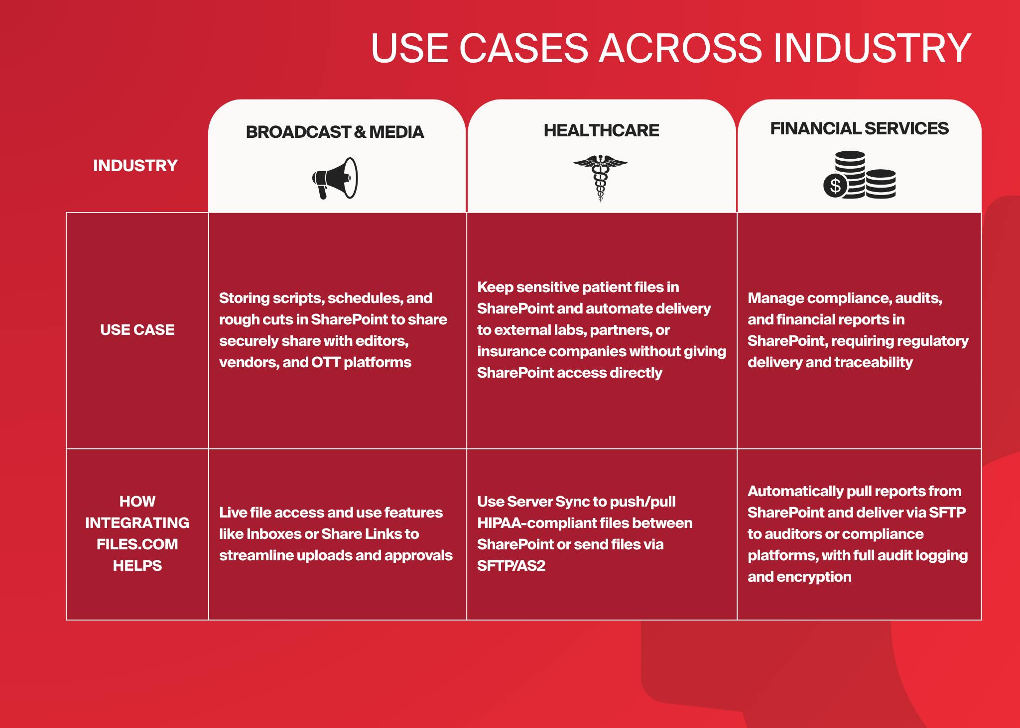 - Healthcare & Life Science: Healthcare providers store sensitive patient files in SharePoint and need to automate delivery to external labs, partners, or insurance companies without giving SharePoint access directly. By integrating Files.com, organizations can use Server Sync to push/pull HIPAA-compliant files between SharePoint or send files via SFTP/AS2.