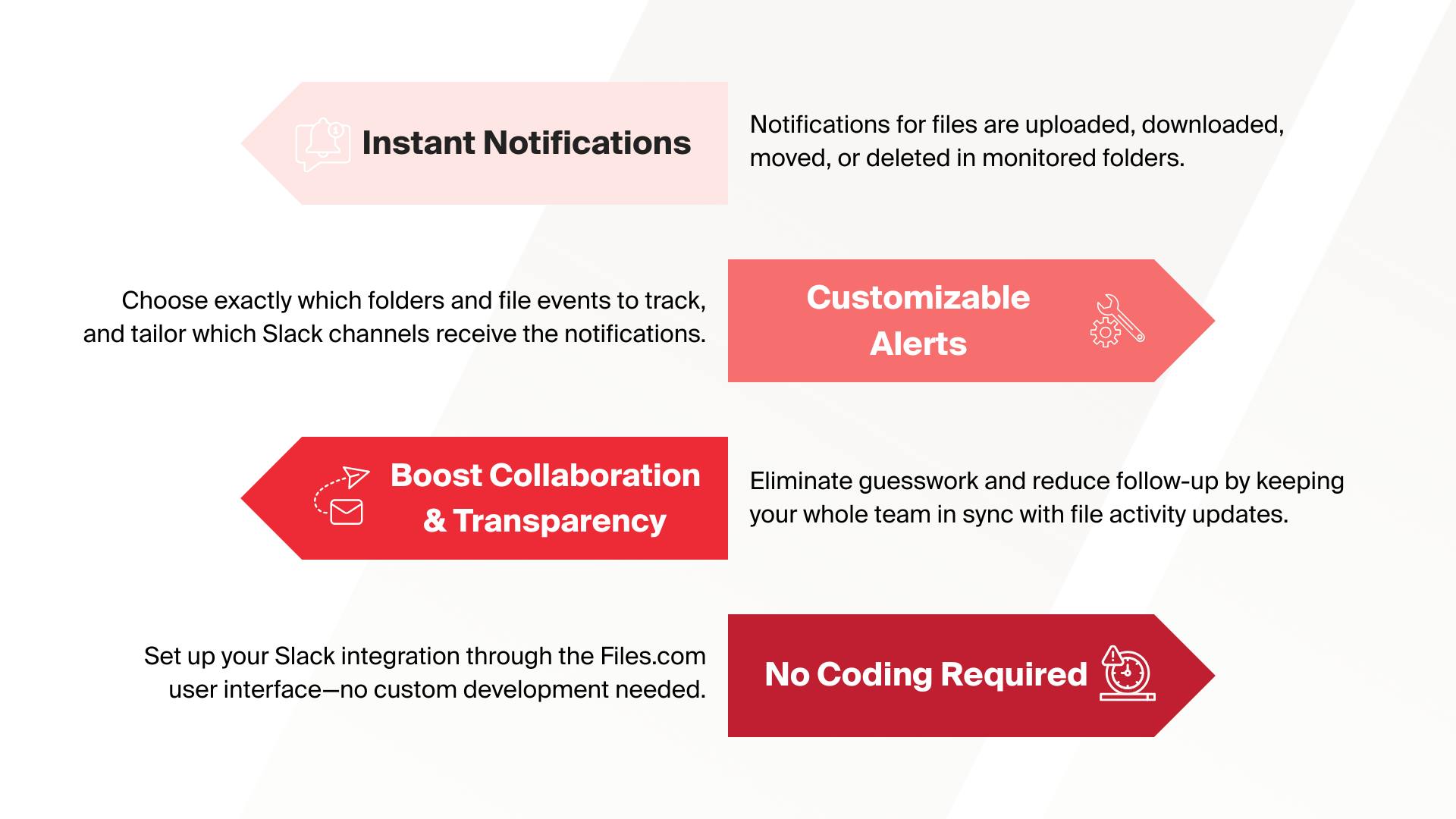 - No Coding Required: Set up your Slack integration through the Files.com user interface—no custom development needed.