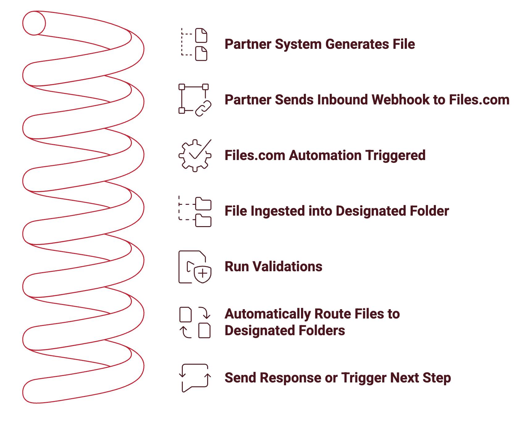 When a partner system generates a file it sends an inbound webhook to a secure Files.com Automation endpoint. This instantly triggers a workflow that ingests the file into the correct folder, performs any necessary validations (like file type checks, virus scanning, or checksums), and routes it to its final destination, such as an SFTP server, S3 bucket, or internal system.