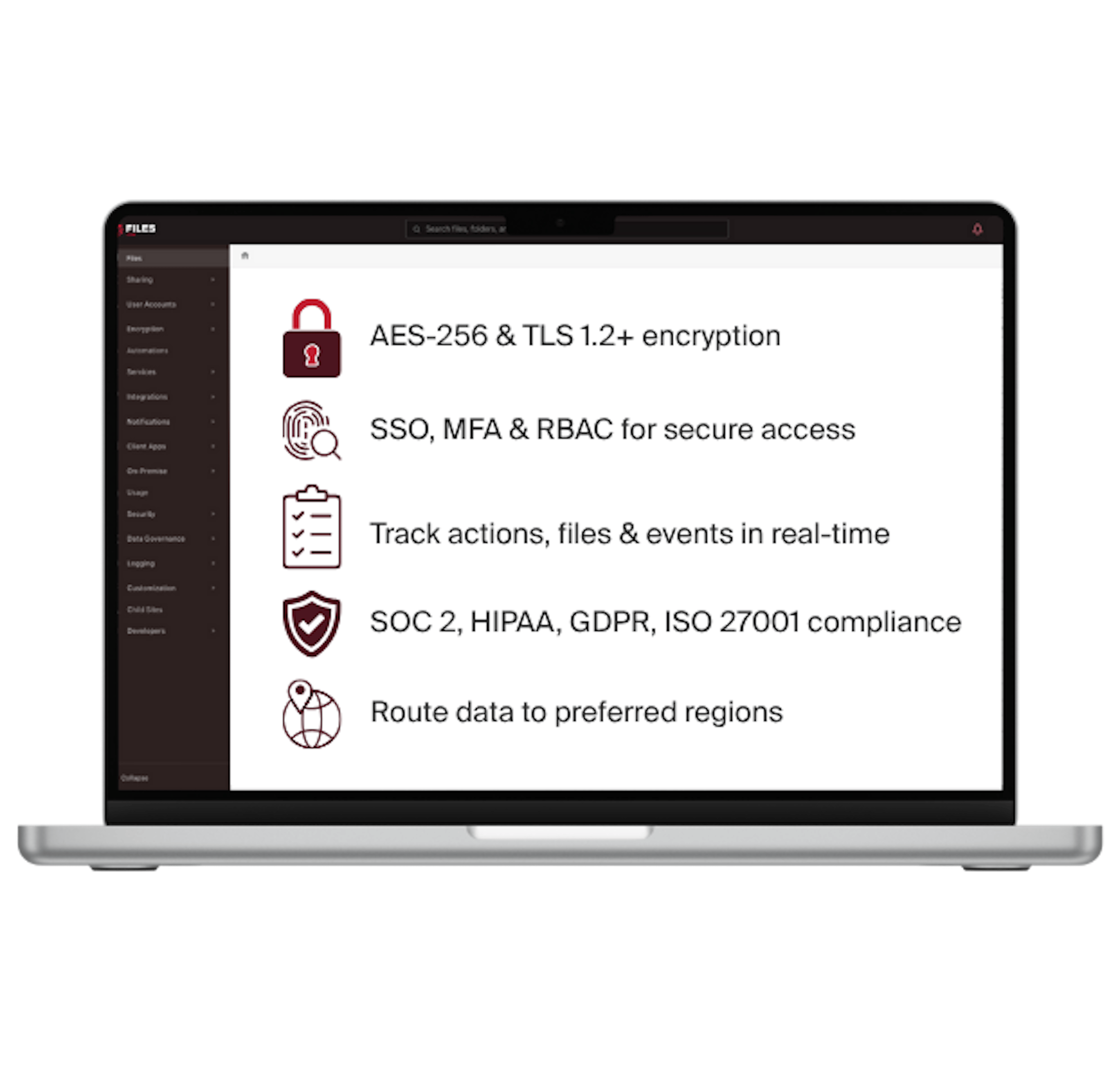 Files.com ensures compliance with HIPAA, SOC 2, and GDPR, safeguarding your data and keeping you aligned with industry regulations.